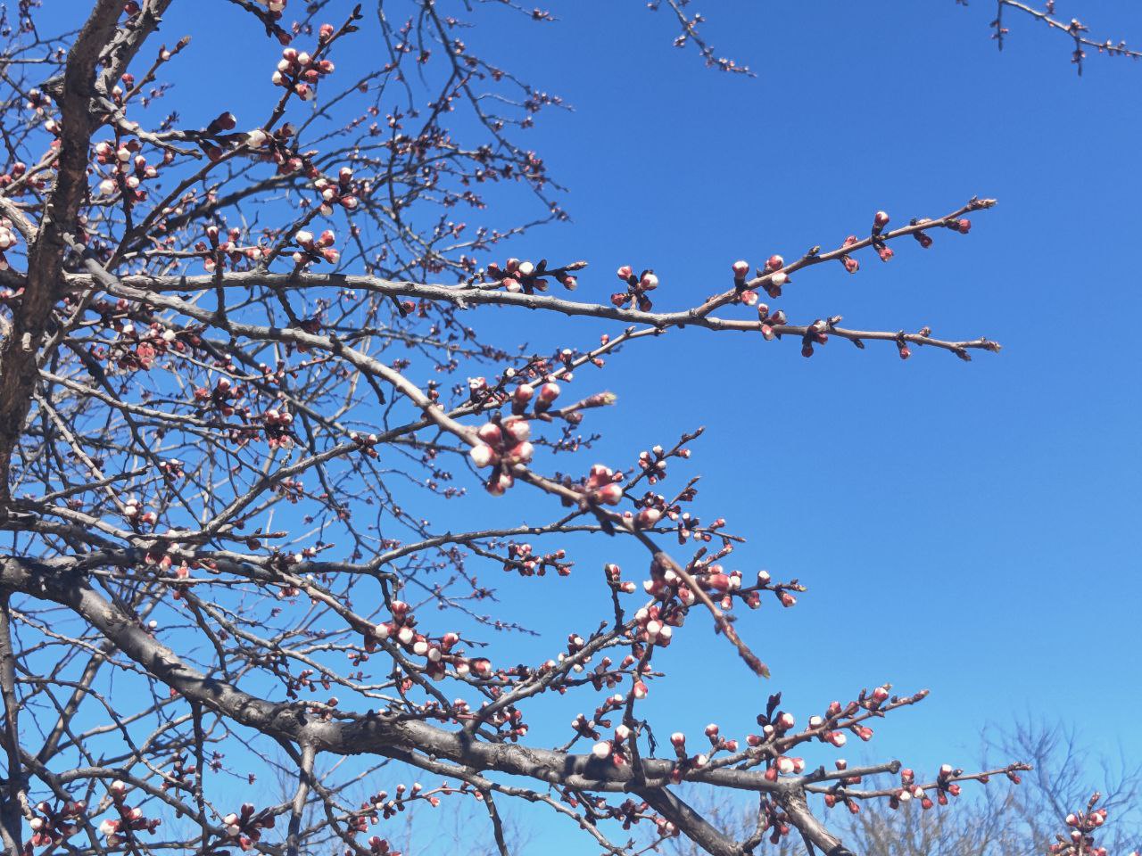 桃花含苞待放,但树枝还是光秃秃的,还没冒出新芽。